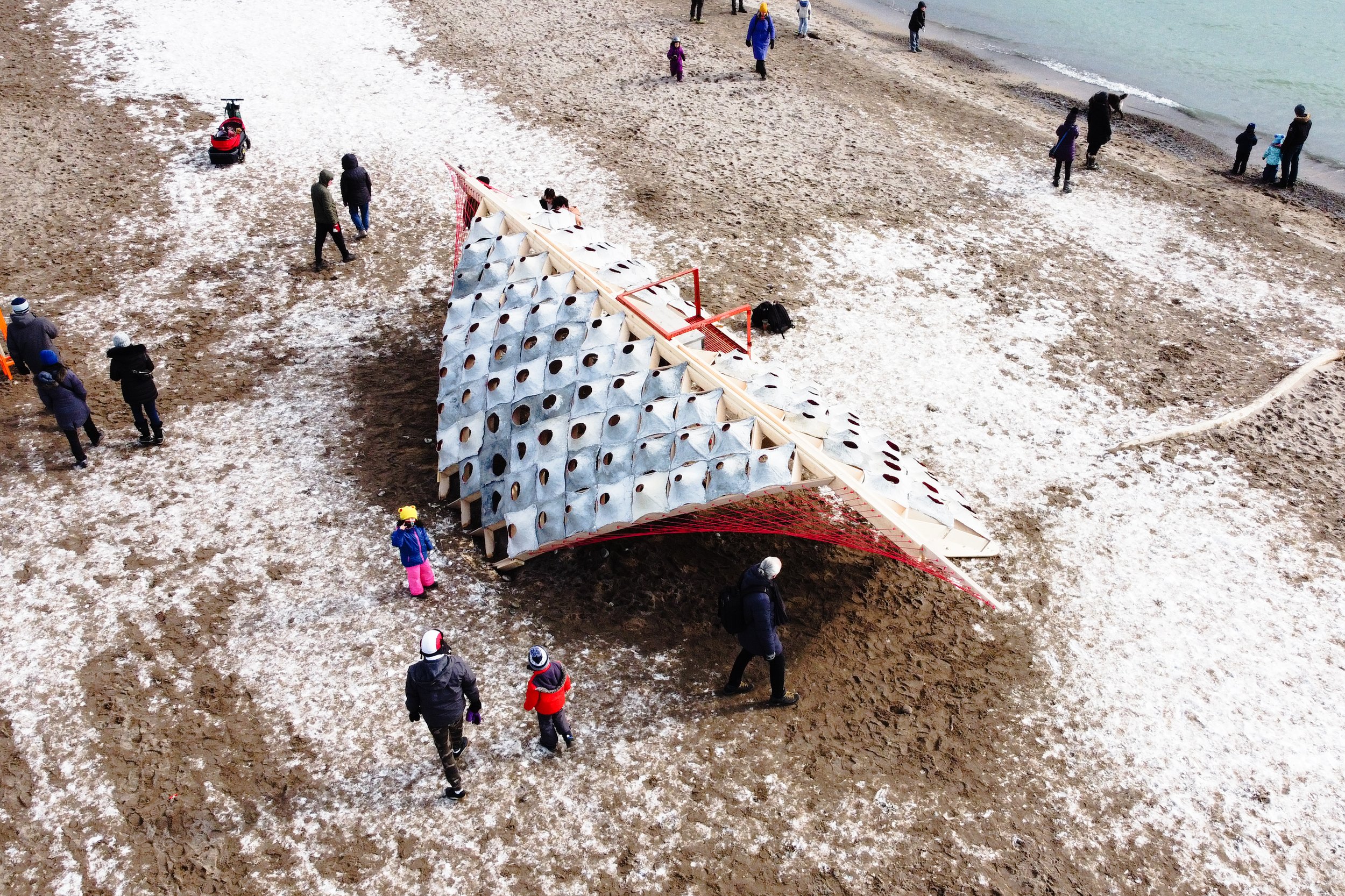 “The forces of nature are relentless. Like the falling snow of the sky and the shifting sands of the beach, the pavilion embraces local wind, snow, and sun conditions. Following these directions of force, the pavilion’s wings embody movement by harnessing snow and mitigating strong winds. Beach towels have been formed into dynamic concrete panels with varying openings. These panels control the amount of light and snow allowed to enter, while also creating unique views outwards. Together, the panels and wings protect users and encourage them to engage with their surroundings. Where the lifeguard station, beach towels, and marine ropes are more frequently used in the summer, the pavilion achieves resilience by employing these objects in the winter. The pavilion acts as a shelter for the community where winter conditions are celebrated by harnessing and adapting to natural forces.”
